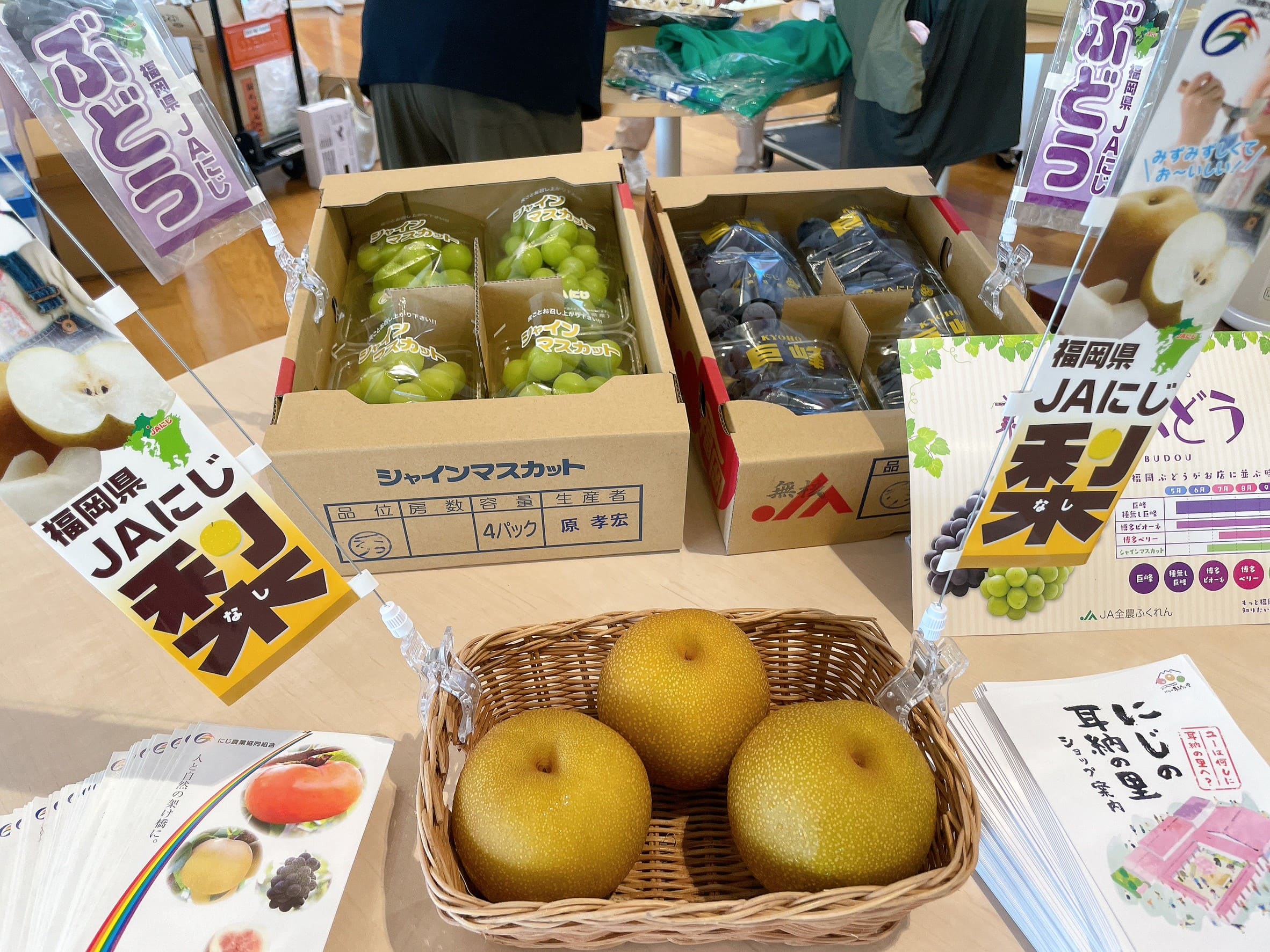 JAにじの皆様にお越しいただき、まさに今が旬の梨、巨峰、シャインマスカットの豪華3種の試食が振舞われました。