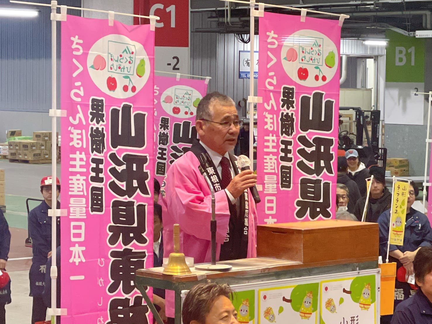 さて、本日はJAさくらんぼひがしね 松浦代表理事組合長をはじめとする関係者の皆様にご来場いただき、卸売場でラ・フランスのトップセールスを開催しました。
