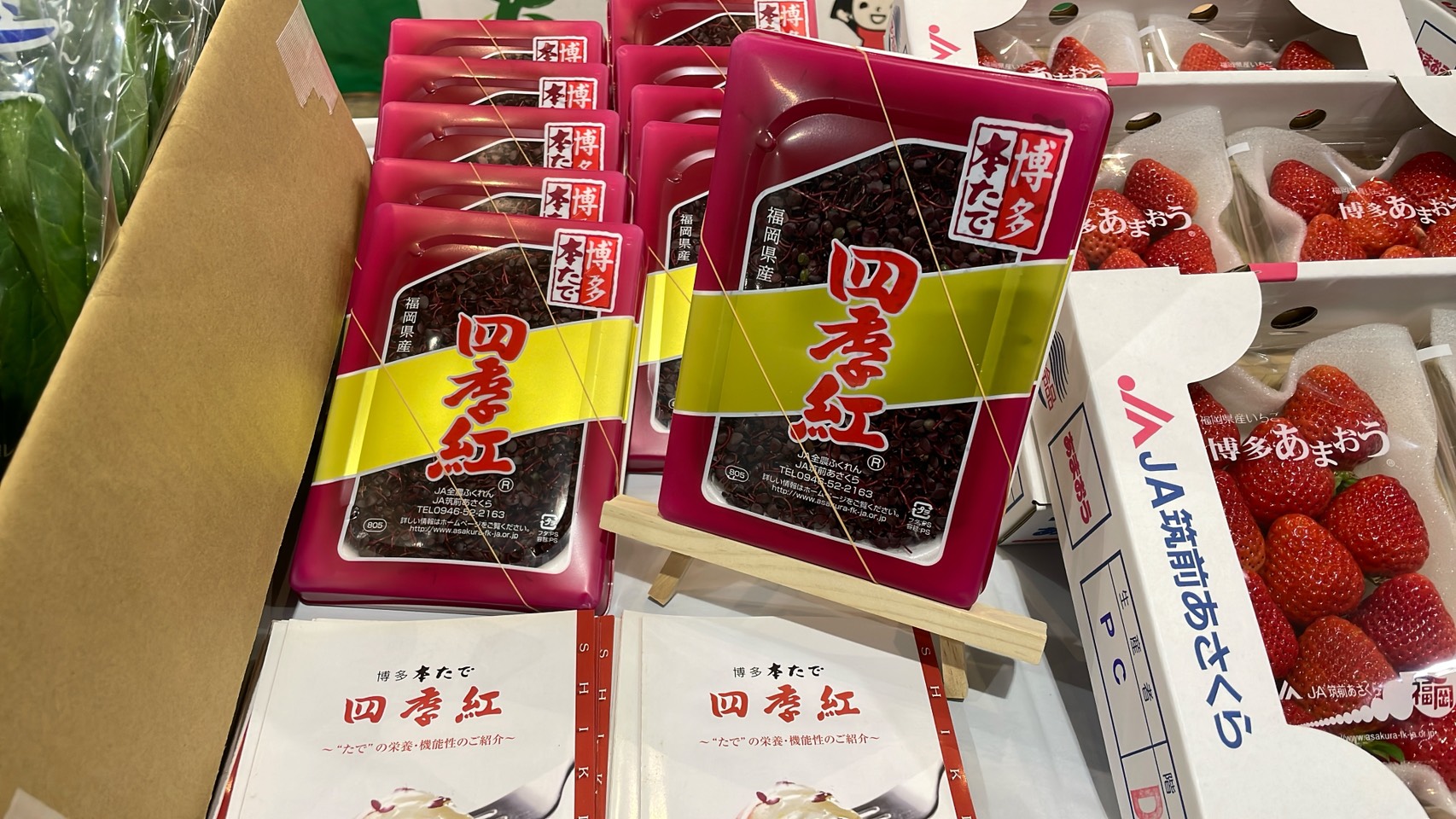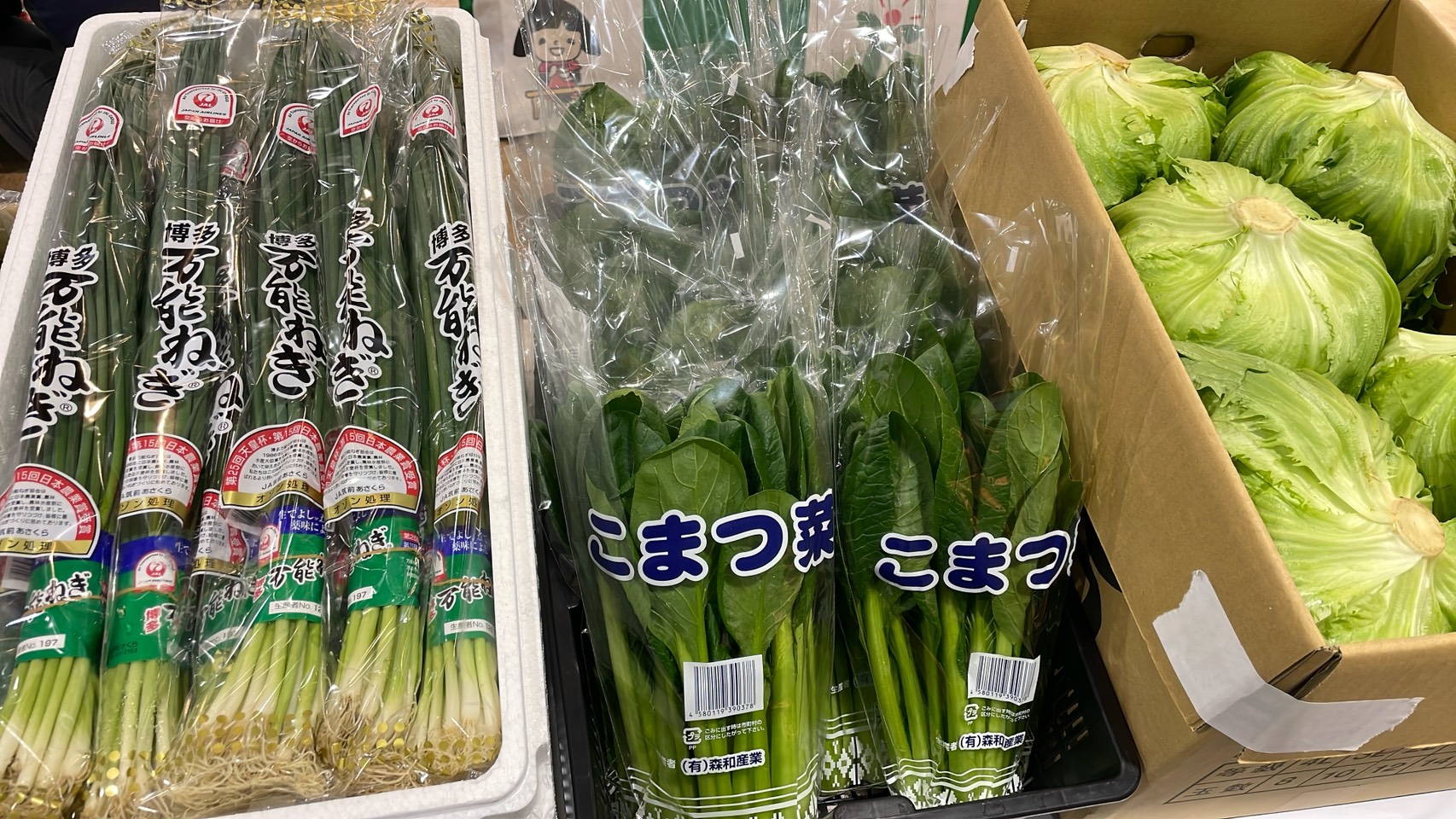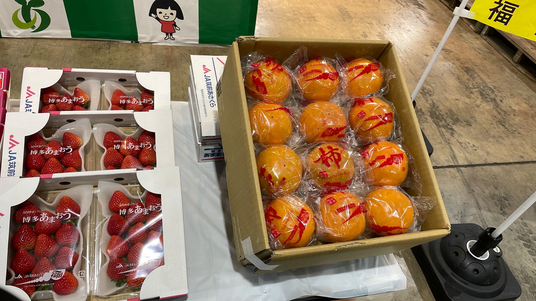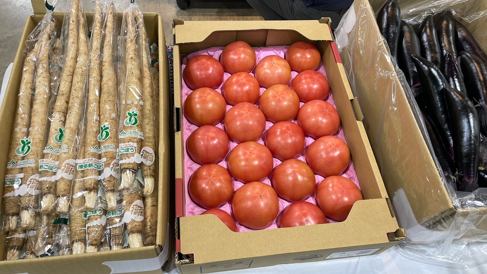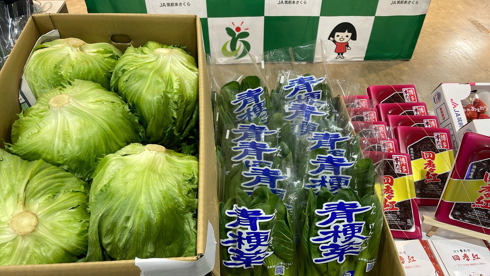 ごぼう、冬春トマト、冬春なす、冬春きゅうり、万能ねき、こまつ菜、レタス、紅たで、チンゲン菜、いちご(あまおう)、冷蔵柿が並びました。
