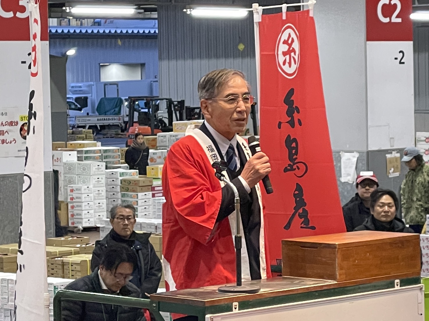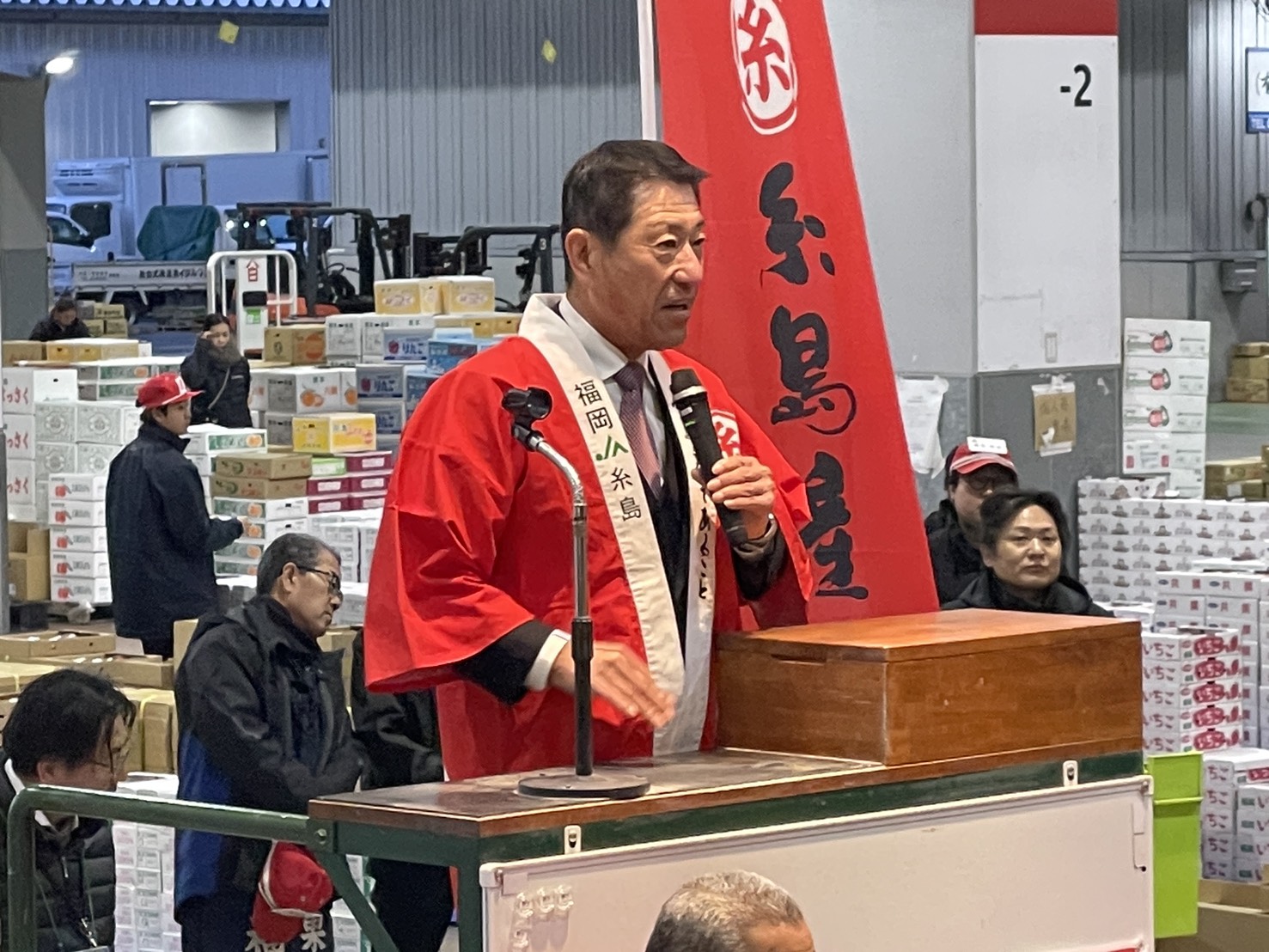 「糸島産のものが今、全国的に注目されております。それもひとえに皆様の努力のお蔭だと思っております。雨不足で心配しておりますが、品質管理をしっかりした上で皆様の食卓に糸島の美味しいものをお届けしてまいりたいと思いますので、生産者の皆様が誇りをもって育てた青果物をどうぞよろしくお願いいたします。」