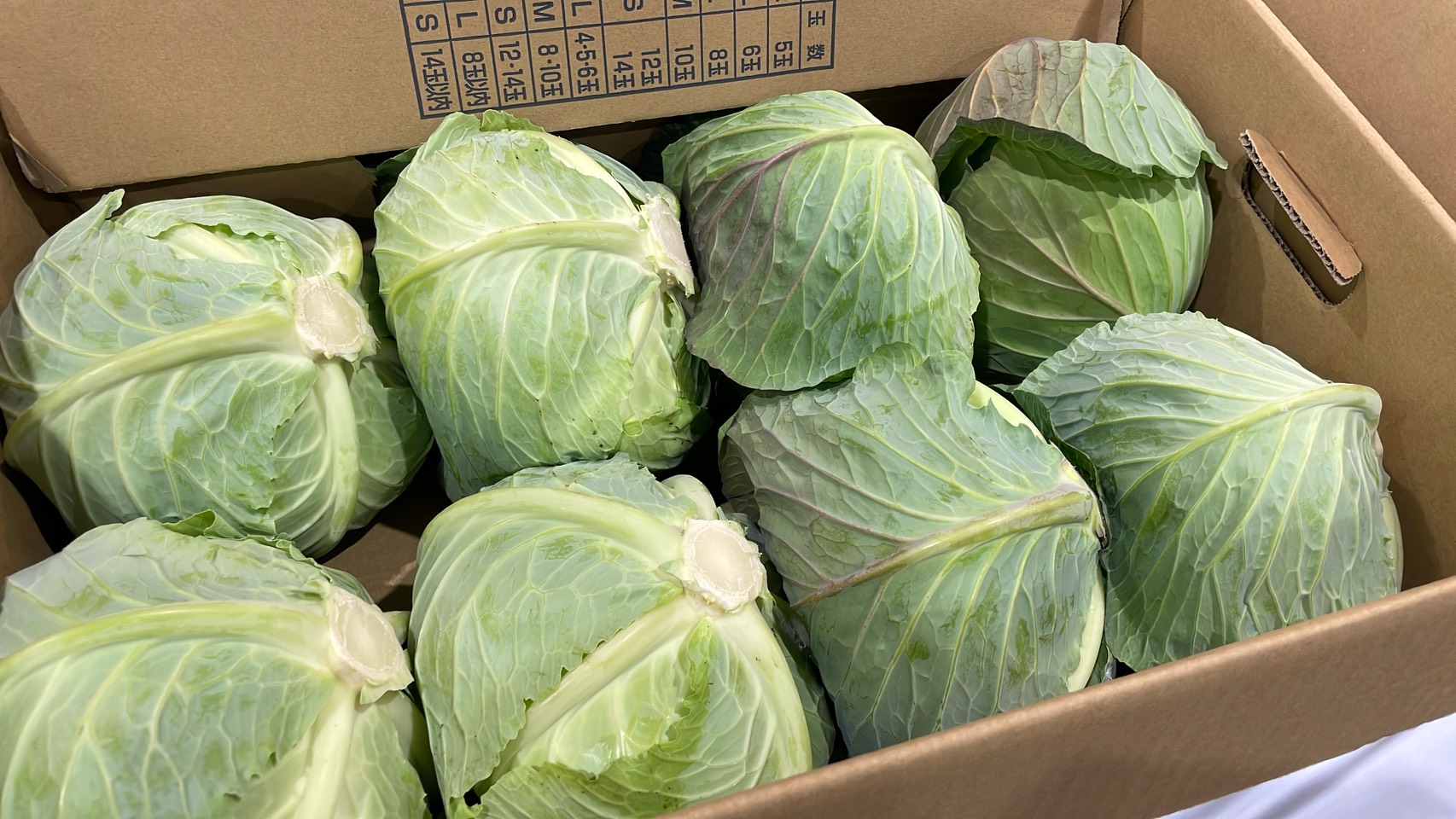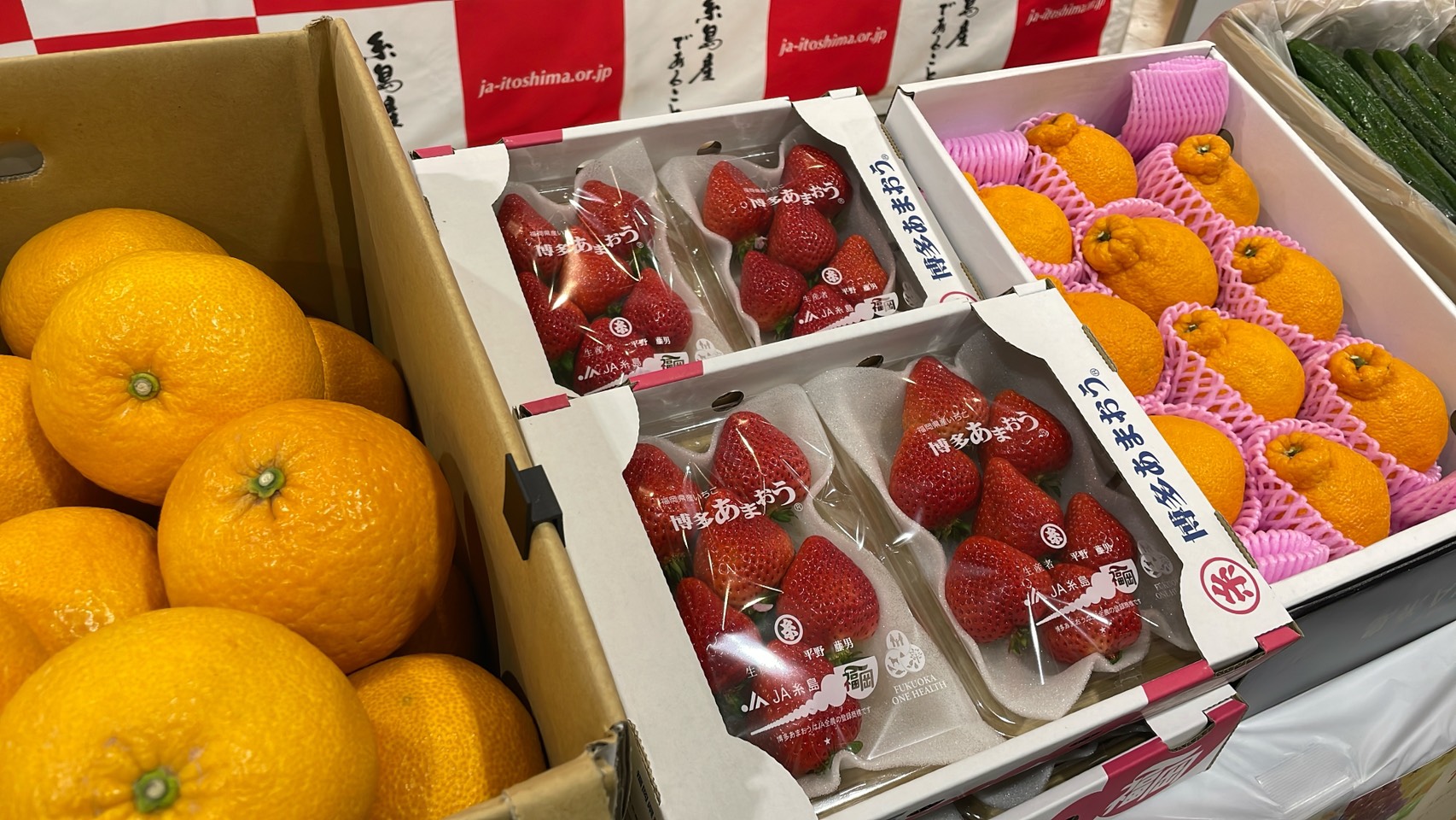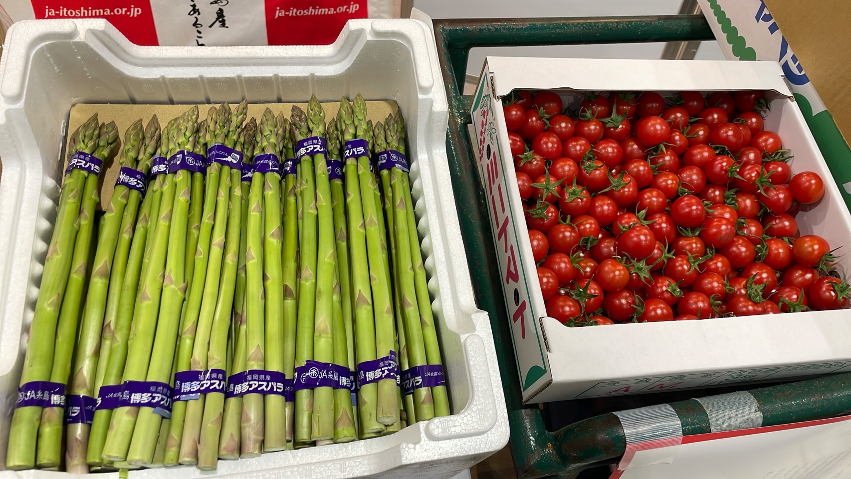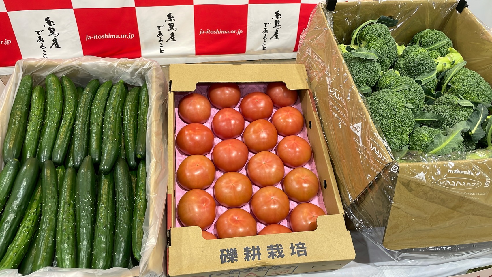 卸売場には糸島産の 菜の花、博多なす、キャベツ、甘夏、いちご、デコポン、胡瓜、トマト、ブロッコリー、アスパラガス、ミニトマトが並びました。