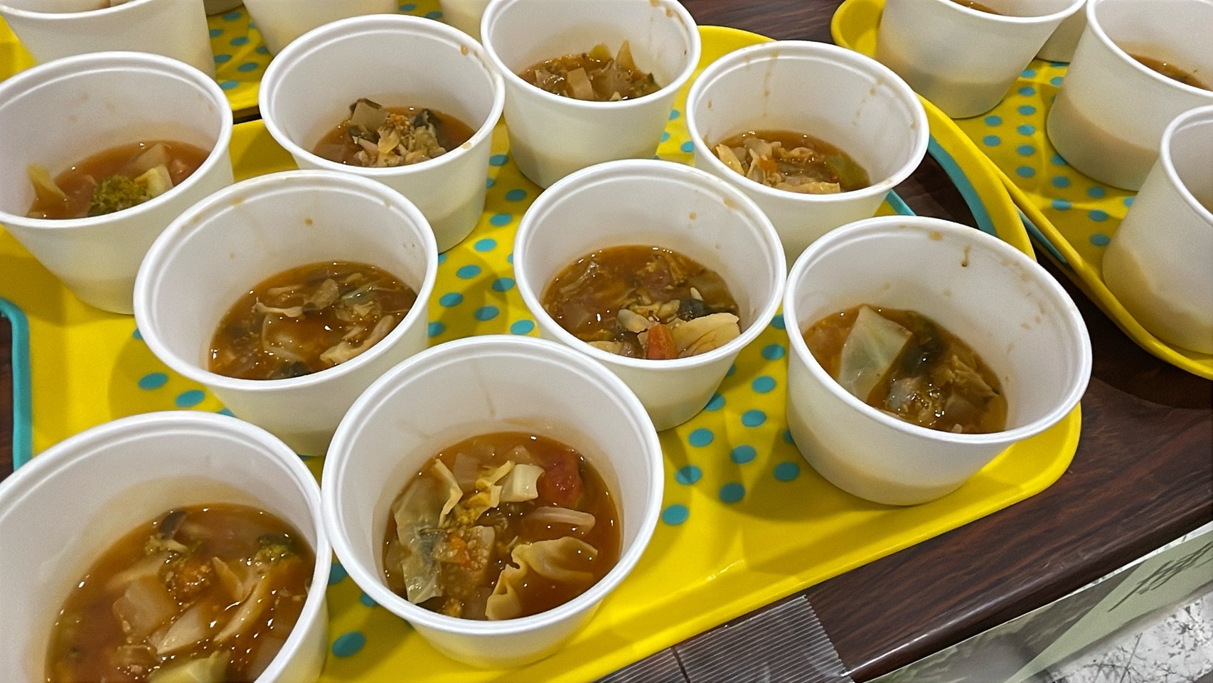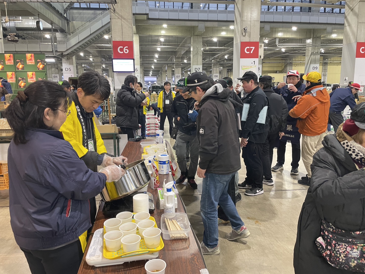 卸売場では、福岡県産野菜の展示に加えて、ダイショーの「ミネストローネ」とコラボした試食が振舞われました。野菜がたっぷりとれるスープは今の時期にも大活躍ですね!