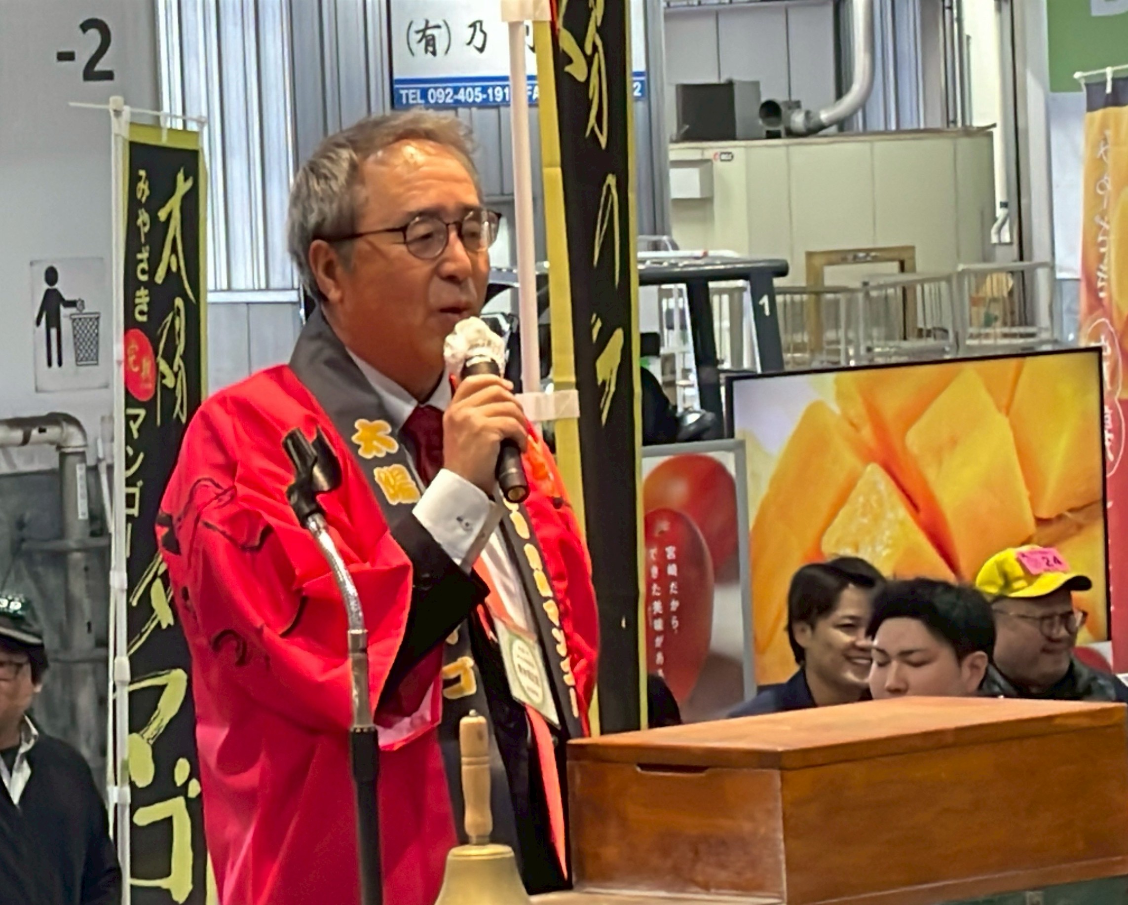 「日頃よりご愛顧いただき、誠にありがとうございます。今年も燦々と輝く宮崎の太陽と生産者の深い愛情をいっぱい浴びた、宮崎の完熟マンゴー『太陽のタマゴ』が解禁いたしました。シーズン最後までよろしくお願いいたします。それでは『太陽のタマゴ』の解禁日を宣言いたします。ありがとうございます!」