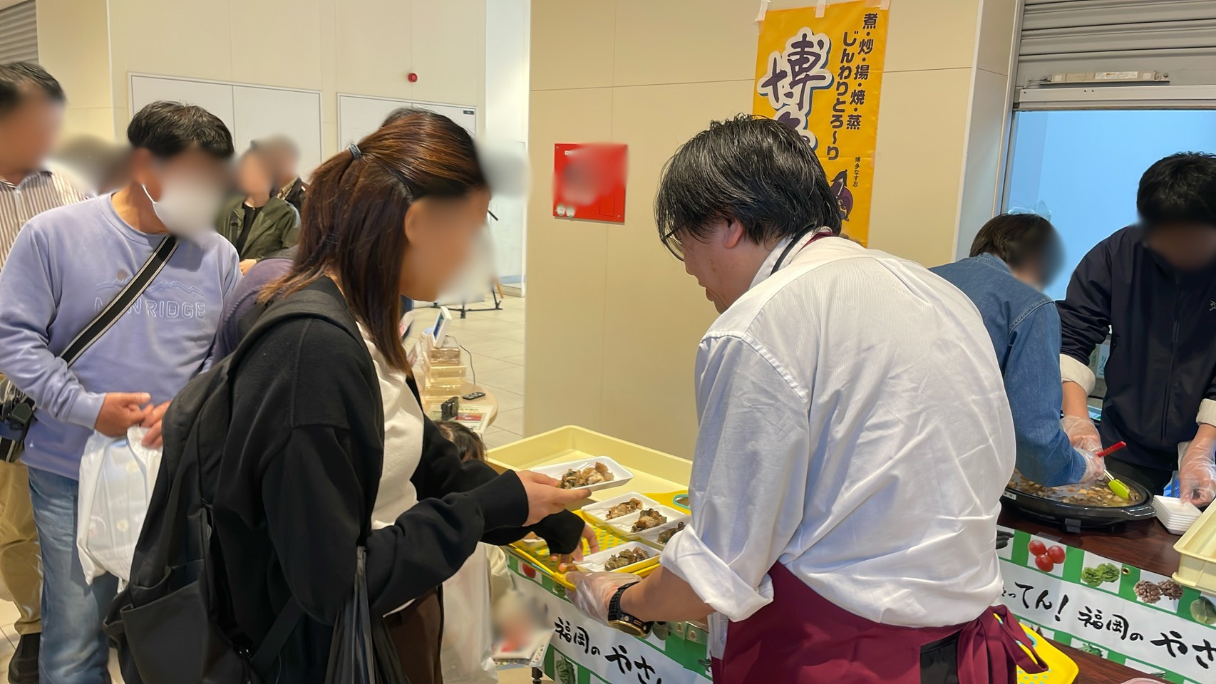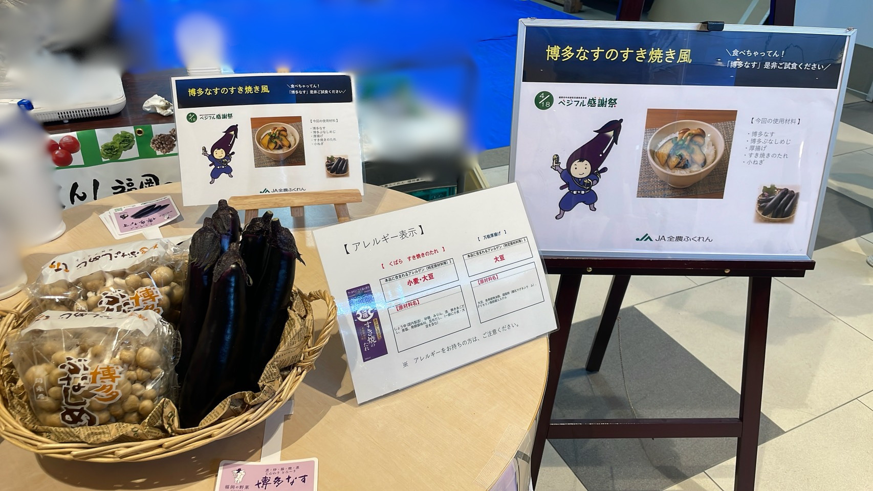 冬春なすの最盛期そして「4月17日はなすび記念日」ということで、JA全農ふくれん主催で「博多なす」「博多ぶなしめじ」を使用した試食(博多なすのすき焼き風)が振舞われました。