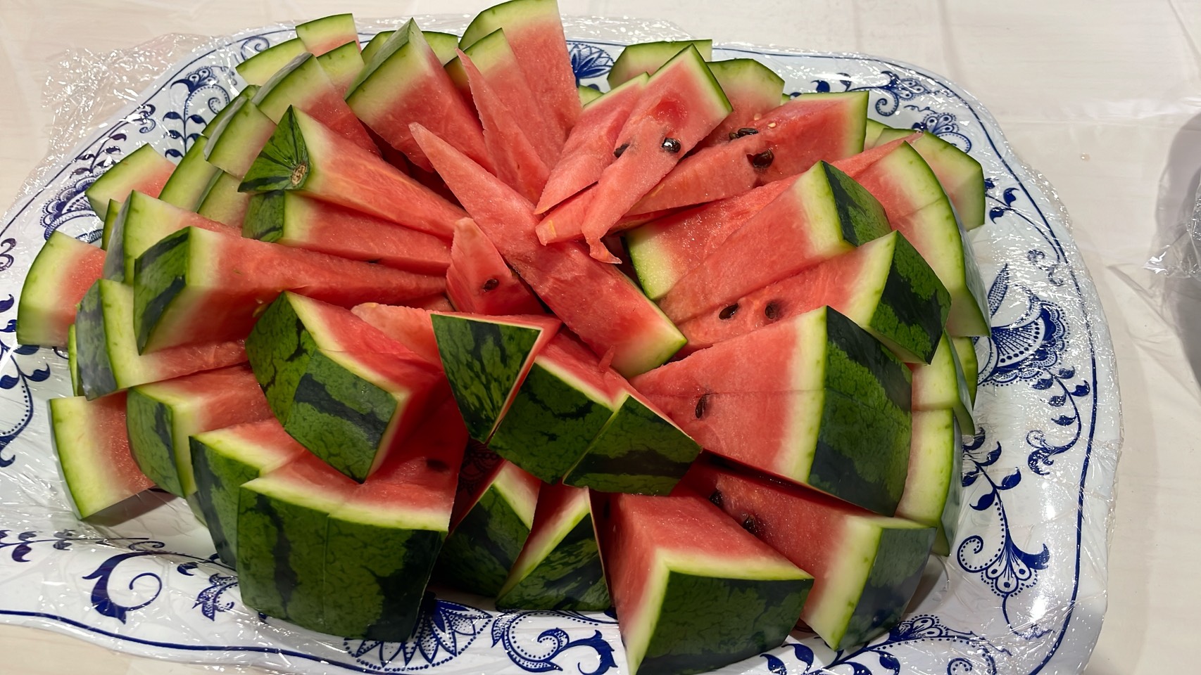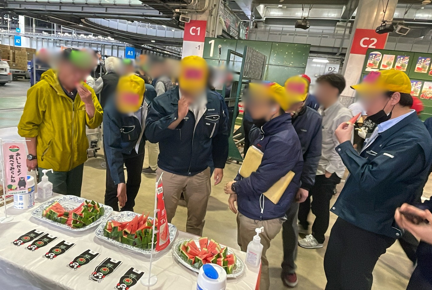 卸売場には長ナス、パプリカ、メロン、西瓜など鹿本の青果物が並び、西瓜の試食が振舞われました。買受人の皆様からは「今年も甘くて美味しい」と好評でしたよ!